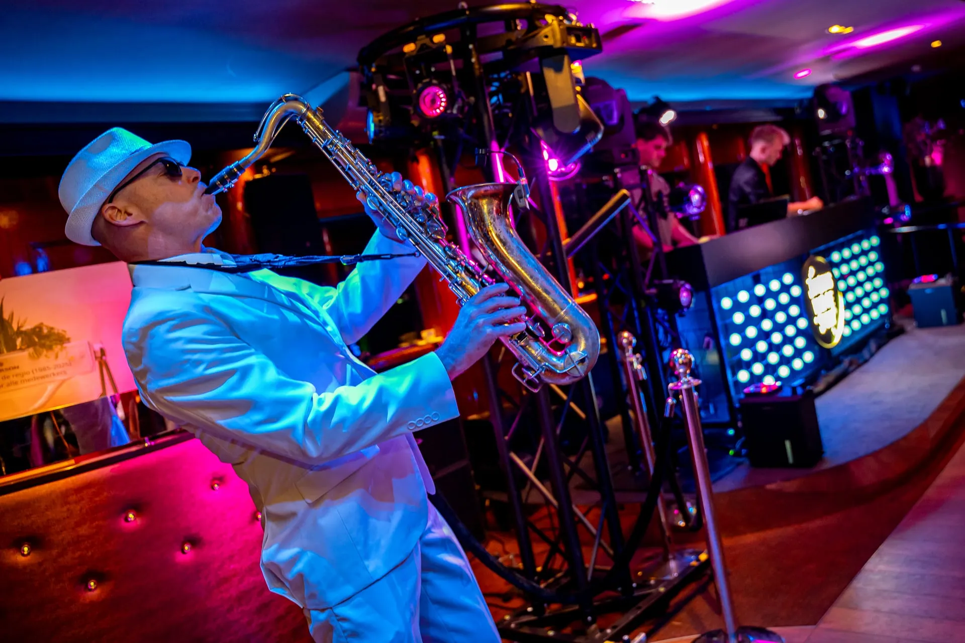 Collaboration fluide entre DJ et saxophone — une seule réservation, un seul spectacle, zéro coordination nécessaire.